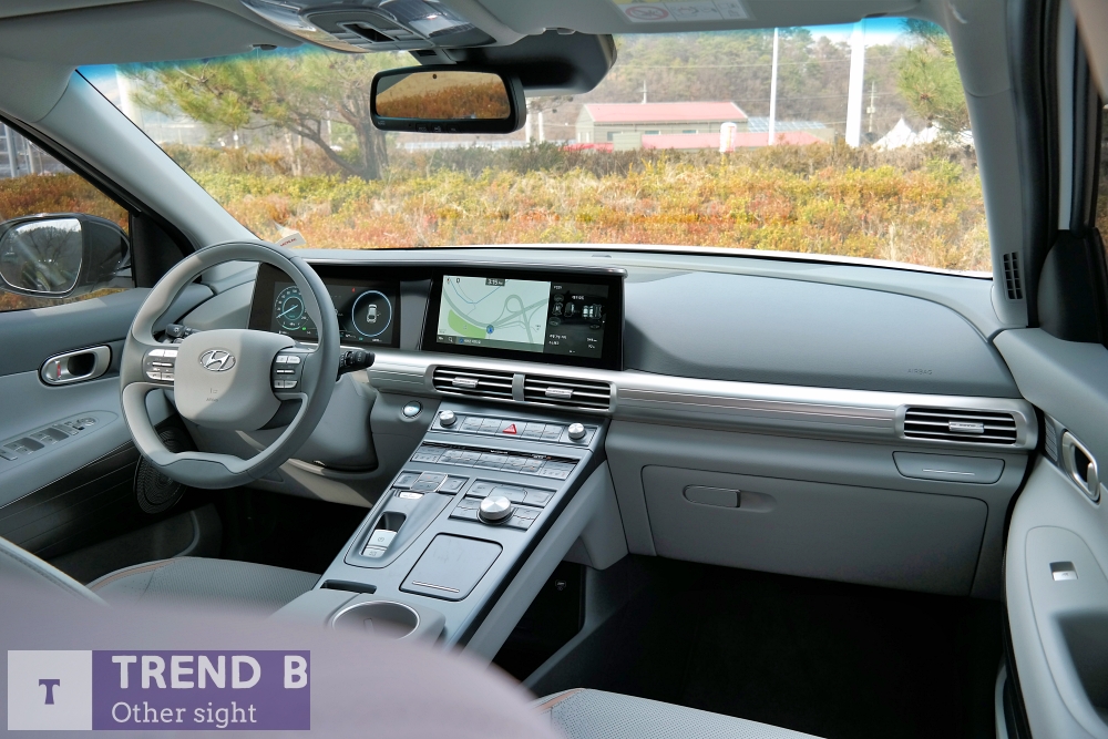 실내의 구성 또한 특별하고 새롭다. 커다란 LCD 클러스터와 인포테인먼트 디스플레이를 필두로 센터페시아와 콘솔을 하나로 묶어 넓은 폭을 가득 채우는 다양한 버튼과 통합 컨트롤 구성은 넥쏘 만의 특별함을 전한다.