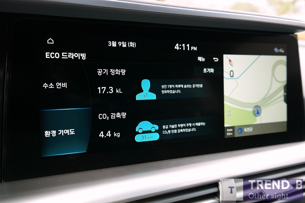 수소전기라는 유일무이한 동력원을 디스플레이를 통해서 정보를 전달하고 이를 통해서 친환경에 기여를 얼마만큼 했는지? 알려주는 정보 등은 넥쏘를 구입한 소비자들의 프라이드를 높여주기도 한다.