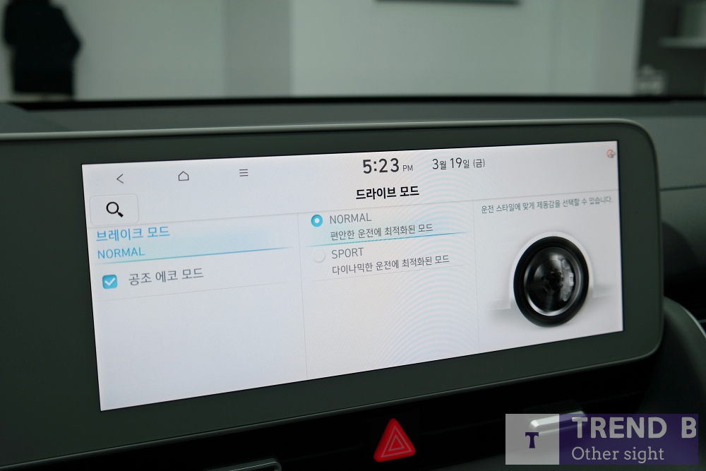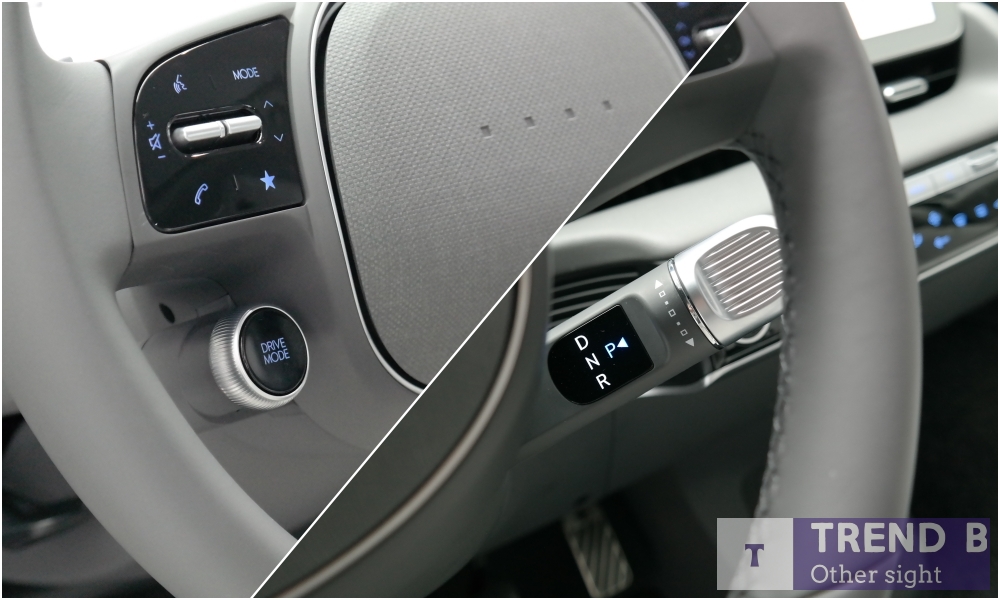 스티어링에 구성된 드라이브 모드 다이얼, 칼럼식 전자식 변속레버 등을 새롭게 선 보인다. 드라이브 모드는 노멀, 스포츠 2가지 모드를 제공하는데 구동뿐만 아니라 제동에 있어서도 노멀, 스포츠 2가지 모드를 제공 해 가감속에 대한 주행 성능을 보다 탄력적으로 운영할 수 있도록 구성하고 있는데 듀얼 모터와 조합을 통해서 보여주게 될 주행성능에 대한 기대감이 높아지는 부분이다.