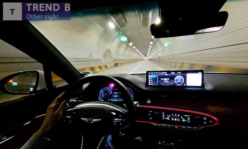 주행을 시작하면 스마트스트림 엔진의 특유의 한 없이 부드럽고 조용한 엔진의 회전질감이 프리미엄에 걸맞는 기분 좋은 출발을 알린다.