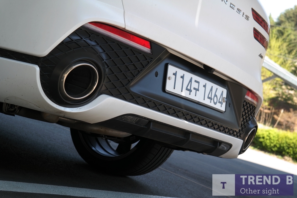 원형의 커다란 듀얼 배기팁과 블랙으로 처리한 범퍼 가니쉬, 두줄 테일램프 디자인의 조합은 심플한 구성이라기 보다는 빈 공간을 가득 채우는 간결한 선들의 완성이다. 전면에서 느껴지는 역동적인 모습은 후면에서도 고스란히 이어가며 고급스럽지만 잘 달라는 스포츠 SUV 임을 시각적으로 충분히 느껴지는 스타일을 완성했다.