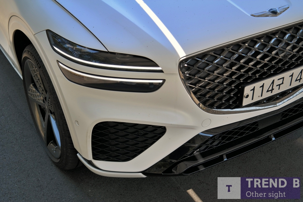 마주한 GV70 스포츠 패키지는 브랜드의 존재감을 한 눈에 알아 볼 수 있는 강렬한 존재감을 드러낸다. 두줄 헤드램프 디자인에서 부터 볼륨감을 극단적으로 높이고 커다한 에어 인테이크 디자인, 간결하면서도 유려한 면과 선들이 심플하지만 고급스럽고 역동적인 첫 인상을 심어 준다.