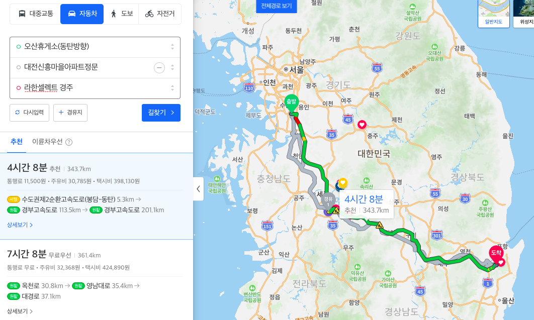 그렇게 다시금 약 2시간을 달려 도착한 경주는 여행을 떠난 인파들로 인해서 보문관광단지까지 가다 서다를 반복하는 극심한 정체를 뚫고 가야만 했다. 그럼에도 막히는 구간이 짜증이 나지 않았던 이유는 북경주 톨게이트를 빠져나올 때쯤 남은 주행거리가 약 60km였고, 목적지까지 30km가 넘게 주행을 해야 했기 때문이다.