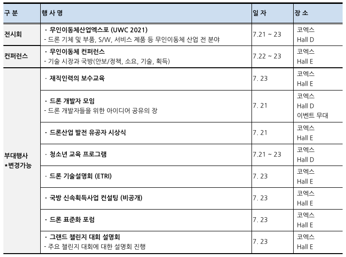 | <2021 무인이동체산업엑스포> ㆍ개최 일정 : 2021.9.26(일) ~ 09.28(화) / 서울 코엑스 전시장 3층 D홀 ㆍ주최 : 산업통상자원부, 과학기술정보통신부, 국방부, 방위사업청, 국토부 ㆍ주관 : 한국산업기술평가관리원, 한국연구재단, 한국항공우주연구원, 국방과학연구소, 항공안전기술원, 국토교통과학기술진흥원,한국무인이동체연구조합, 코엑스, 한국드론산업진흥협회 ㆍ홈페이지 : http://uwc.center/ |