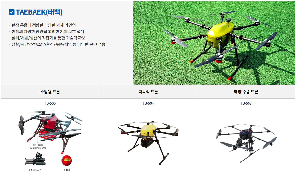 '태백(TAEBAEK)' 이라는 이름의 현장 적합형 무인 비행체 드론은 소방용, 다목적, 해양 수동 드론으로 나눈다. 소방용 드론은 다양한 소방 임무 장비 구성을 통한 화재 진압 및 지원을 하며 소화탄 투하, 발사, 강화유리 파괴탄 발사, 야간 조명 등으로 사람의 생명과 안전을 지키는 역할을 한다.