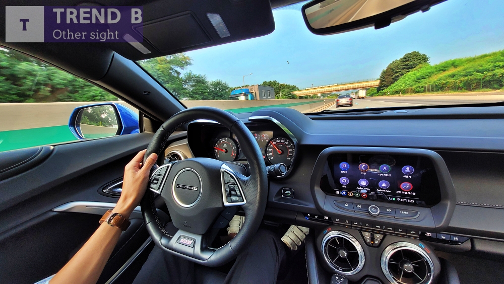 카마로를 상징하는 커다랗고 두툼한 3 포크 스티어링 휠, 다양한 정보를 제공하는 디지털 정보창, 카플레이, 안드로이드 오토를 지원하는 인포테인먼트, 간결하지만 부족함 없는 HUD 등은 마치 선을 넘지 않으면서 드라이빙과 편의성 그리고 가격의 타협점을 찾으려는 최상의 노력이라는 생각이다.